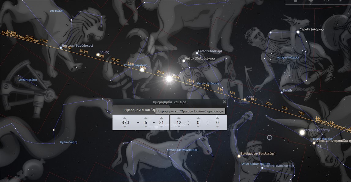 Η εικόνα από το λογισμικό ανοιχτού κώδικα stellarium δείχνει τον ουρανό και τη θέση του Ήλιου στις 21 Ιουνίου του 370 π.Χ. στις 12:00 ακριβώς.
