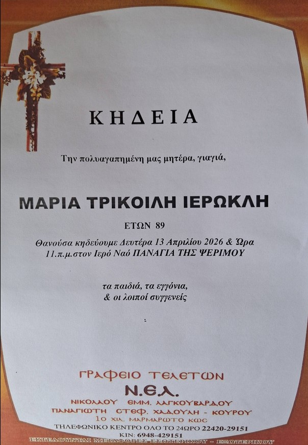 Η εξόδιος ακολουθία θα τελεστεί την Δευτέρα του Πάσχα 13 Απριλίου και ώρα 11πμ στον ΙΝ της Παναγίας στην Ψέριμο.