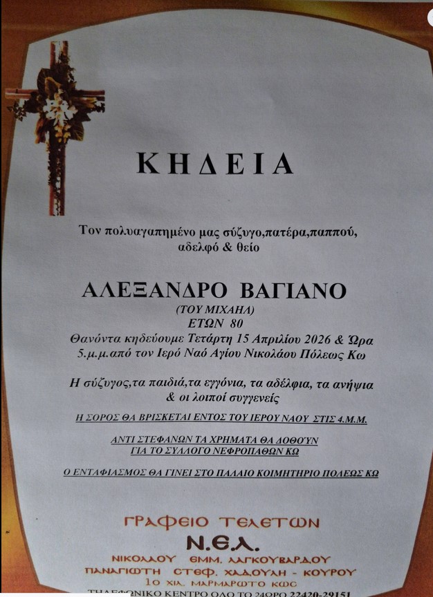Η εξόδιος ακολουθία θα τελεστεί απόψε στις 5μμ από τον ΙΝ Αγίου Νικολάου Κω. Η σορός θα βρίσκεται εντός του ιερού ναού μία ώρα νωρίτερα.