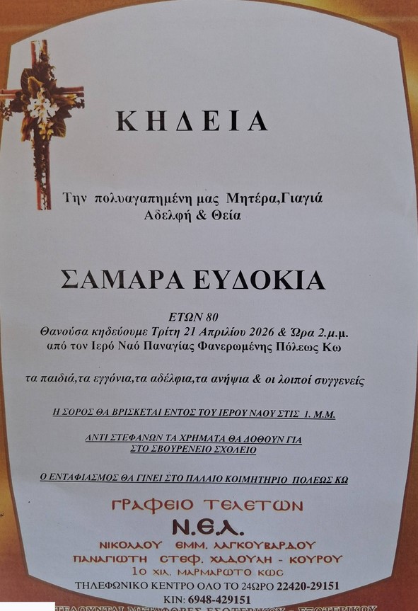 Η εξόδιος ακολουθία θα τελεστεί αύριο Τρίτη 21 Απριλίου και ώρα 2μμ από τον ΙΝ Παναγίας Φανερωμένης Κω.