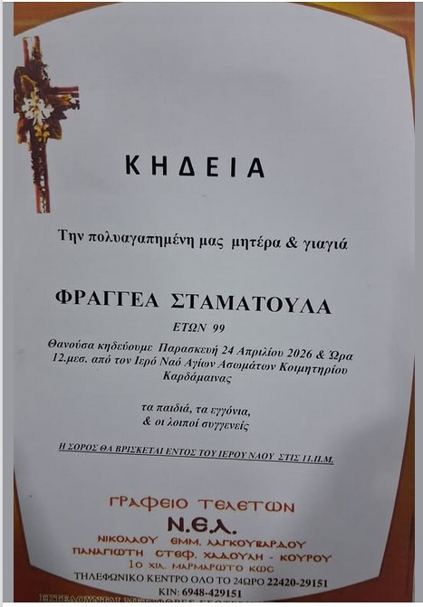 Η εξόδιος ακολουθία θα τελεστεί την Παρασκευή 24 Απριλίου 2026 και ώρα 12 μεσημέρι από τον ΙΝ Αγίων Ασωμάτων Κοιμητήριου Καρδάμαινας.