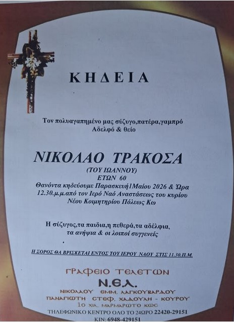 Η εξόδιος ακολουθία θα τελεστεί την Παρασκευή 1η Μαΐου 2026 και ώρα 12:30 από τον ΙΝ Αναστάσεως του Κυρίου στο νέο κοιμητήριο Κω.