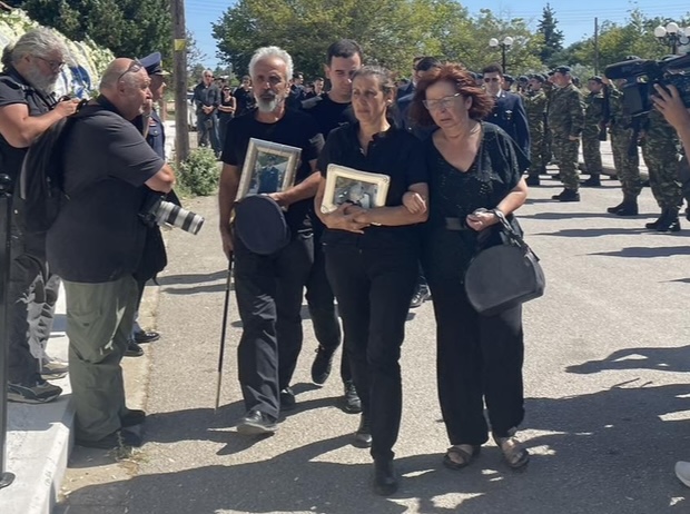 Τραγικές φιγούρες οι γονείς του και τα μέλη της οικογένειάς του, που έφτασαν στην εκκλησία κρατώντας στα χέρια δυο φωτογραφίες του γιου τους όπου απεικονίζεται εν ώρα πτήσης και με την επίσημη ενδυμασία του Σώματος.