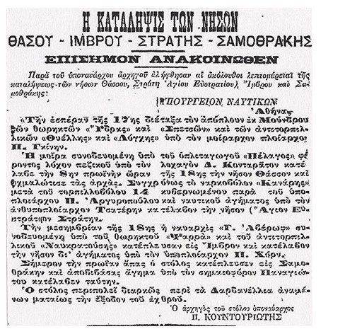 Το φύλο της 20ης Οκτωβρίου της εφημερίδος «Εμπρός», γράφει μεταξύ των άλλων τα εξής:«Η ΚΑΤΑΛΗΨΗ ΤΩΝ ΝΗΣΩΝ ΘΑΣΣΟΥ ΙΜΒΡΟΥ – ΣΤΡΑΤΗΣ ΣΑΜΟΘΡΑΚΗΣ ΕΠΙΣΗΜΟΝ ΑΝΑΚΟΙΝΩΘΕΝ Παρά του υποναυάρχου αρχηγού ελήφθησαν αι ακόλουθοι λεπτομέρειαι της καταλήψεως των νήσων Θάσου, Στράτη Αγίου Ευστρατίου), Ίμβρου και Σαμοθράκης…. Σήμερον την πρωΐαν άπας ο στόλος κατέπλευσεν εις Σαμοθράκην και αποβιβάσας άγημα υπό του σημαιοφόρου Παναγιώτου κατέλαβον ταύτην. Ο στόλος περιπολεί διαρκώς περί τα Δαρδανέλλια αναμένων ματαίως την έξοδον του εχθρού.Ο αρχηγός του στόλου υποναύαρχος Π. ΚΟΥΝΤΟΥΡΙΩΤΗΣ»