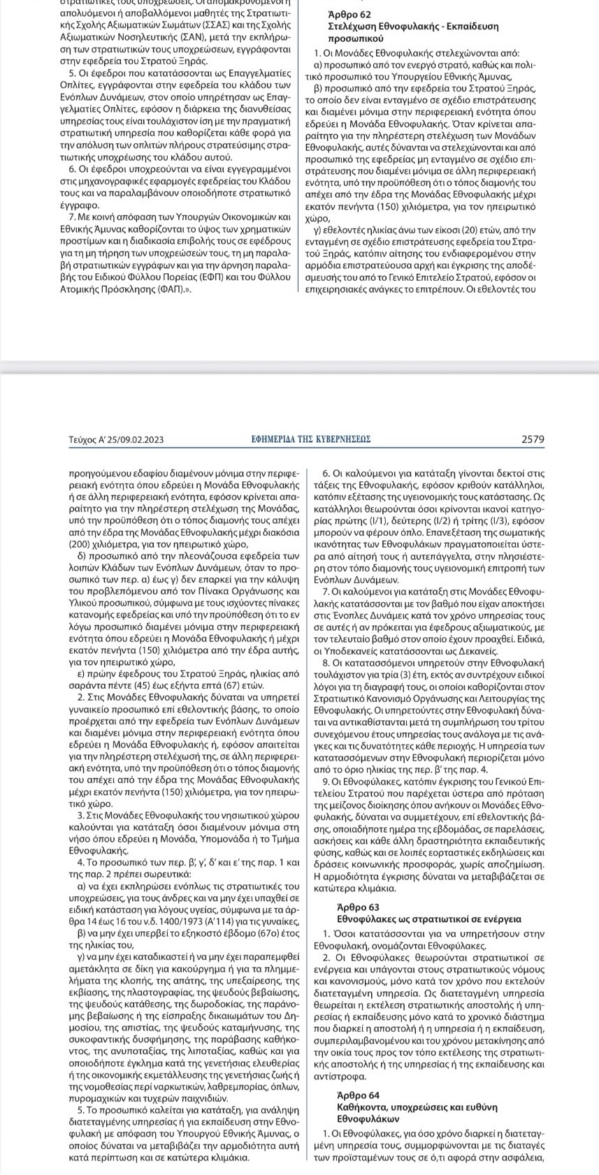 Στην παρ. 1 του άρθρου 62 Στελέχωση Εθνοφυλακής-Εκπαίδευση προσωπικού του ν. 5018/2023 ορίζεται ότι: