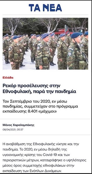 [3] Μάνος Χαραλαμπάκης, «Ρεκόρ προσέλευσης στην Εθνοφυλακή, παρά την πανδημία», https://www.tanea.gr/2021/04/08/greece/rekor-proseleysis-stin-ethnofylaki-para-tin-pandimia/, πρόσβαση 21 Νοε 25.