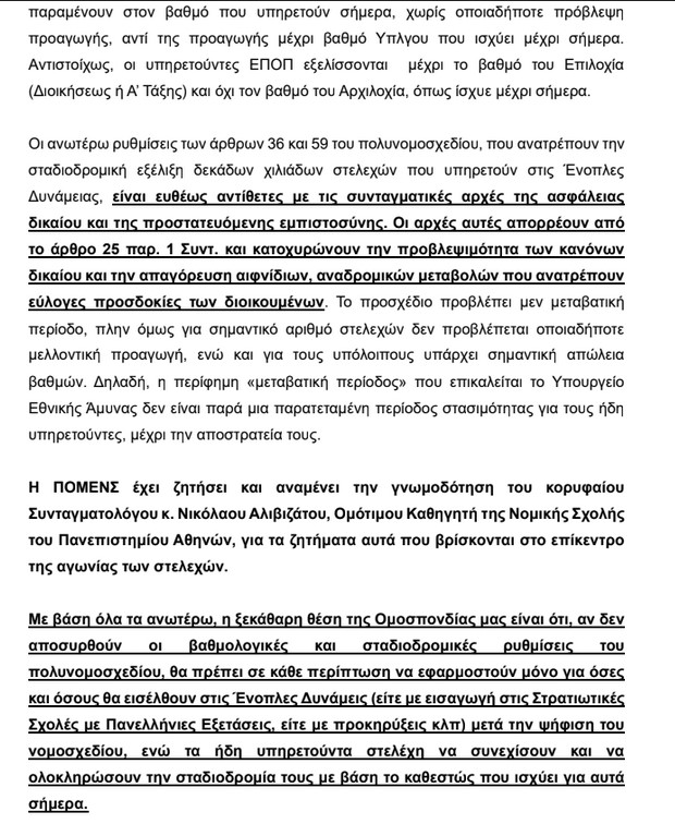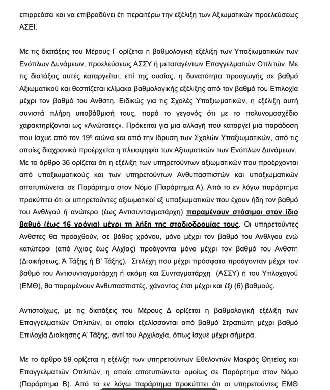Το εν λόγω πολυνομοσχέδιο επιφέρει αιφνίδιες, δυσμενείς και δομικές μεταβολές στο βαθμολογικό και σταδιοδρομικό καθεστώς δεκάδων χιλιάδων ήδη υπηρετούντων στελεχών, χωρίς να έχει προηγηθεί ουσιαστικός θεσμικός διάλογος, συνεργασία ή επεξεργασία με τους νόμιμους εκπροσώπους των στρατιωτικών, κατά παράβαση κάθε αρχής χρηστής διοίκησης.