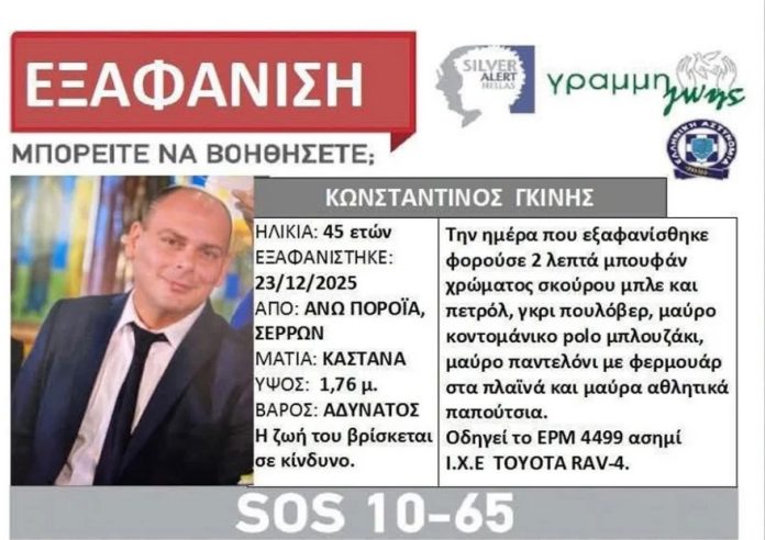 Η εξαφάνιση του 45χρονου άντρα δηλώθηκε στο Αστυνομικό Τμήμα Πορροΐων από τη σύζυγό του, όταν διαπιστώθηκε ότι απουσίαζε από το σπίτι για περισσότερες από 24 ώρες, χωρίς να έχει εμφανιστεί ούτε στην υπηρεσία του.
