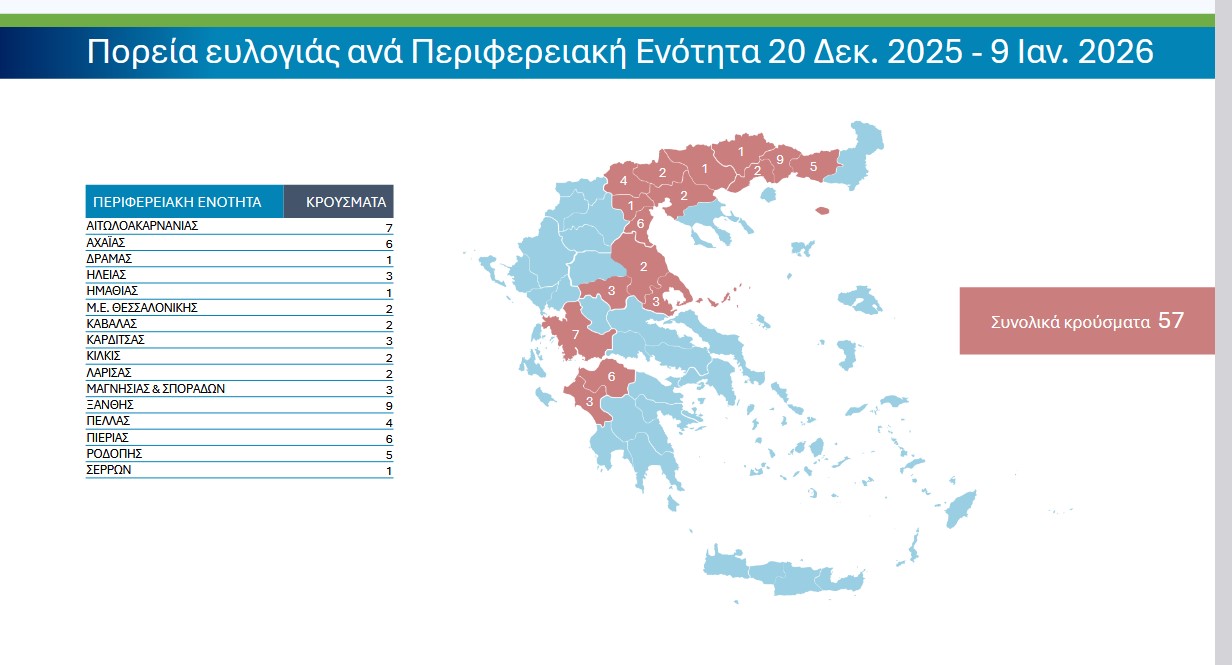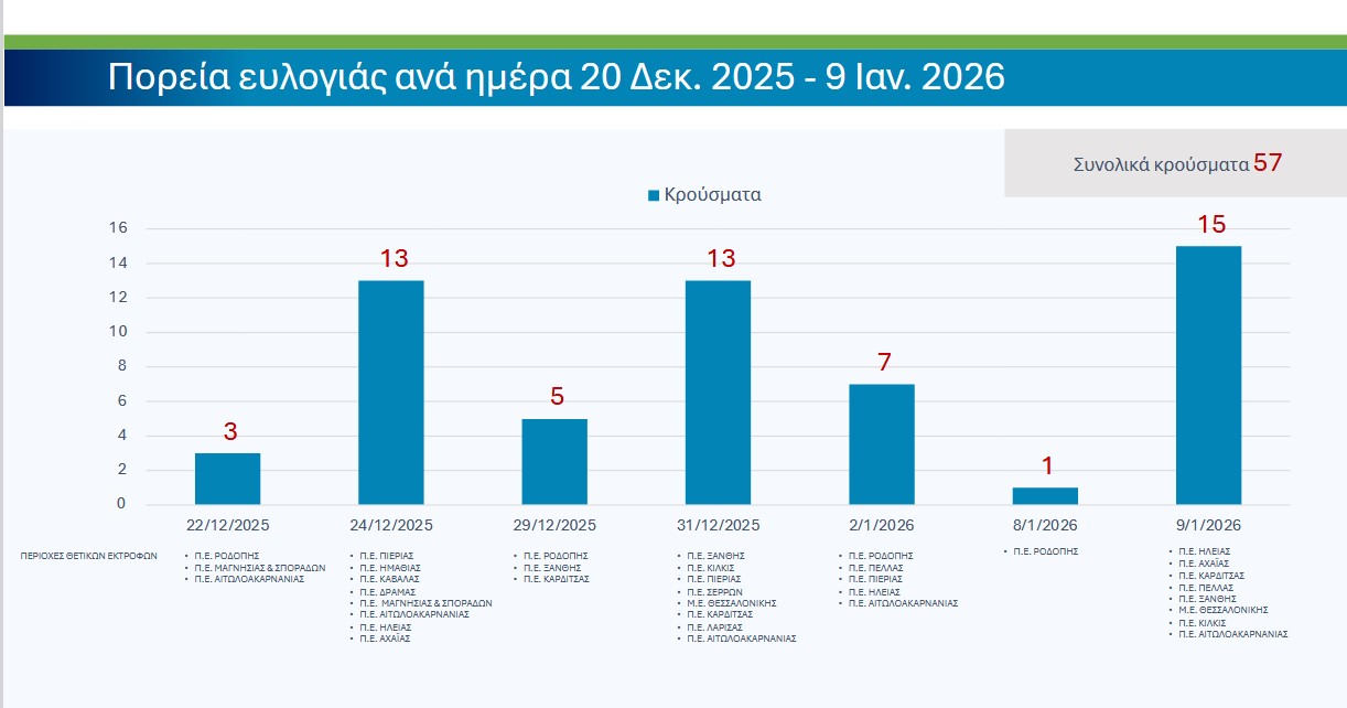 Για την περίοδο αναφοράς 20 Δεκεμβρίου 2025 – 9 Ιανουαρίου 2026 καταγράφηκαν 57 νέα κρούσματα σε 16 περιοχές, βάσει των αποτελεσμάτων των εργαστηριακών ελέγχων.