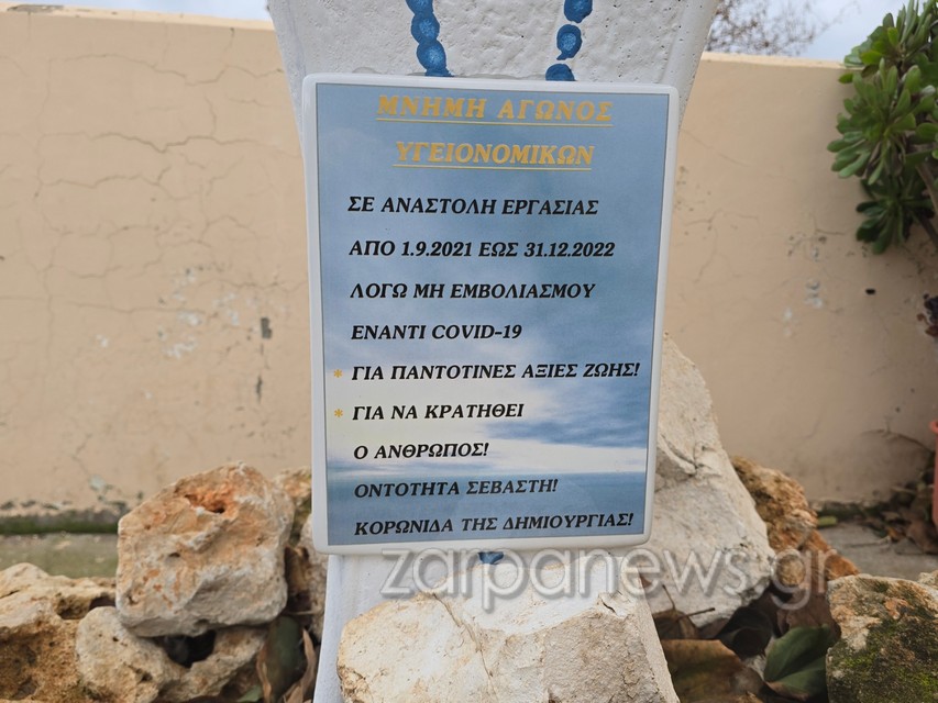 Όπως βλέπετε στις φωτογραφίες του zarpanews.gr, στην σχετική ταμπέλα που το συνοδεύει, αναγράφεται: «Μνήμη αγώνος υγειονομικών. Από 1.9.2021 έως 31.12.2022 λόγω μη εμβολιασμού έναντι covid -19. Για παντοτινές αξίες ζωής. Για να κρατηθεί ο άνθρωπος! Οντότητα σεβαστή! Κορωνίδα της δημιουργίας!»