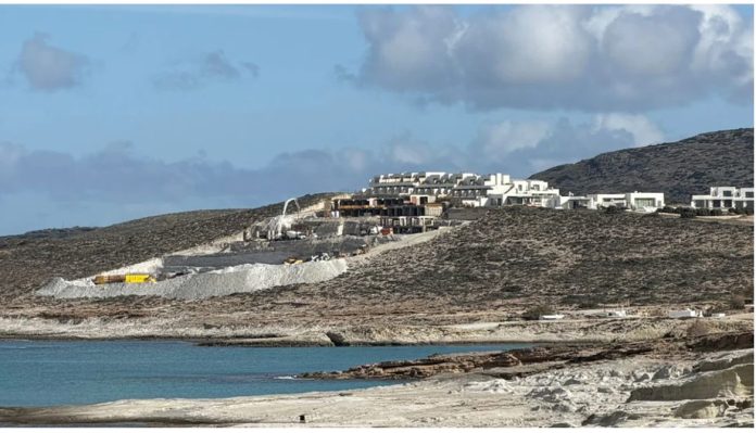 Σημερινές φωτογραφίες και βίντεο από τον Μύτακα της Μήλου πιστοποιούν ότι η καταστροφή του μοναδικού φυσικού κάλλους παραλίας συνεχίζεται εντελώς απρόσκοπτα. Παρά τη γενική κατακραυγή και τις νομικές ενέργειες του Δήμου Μήλου καθώς και περιβαλλοντικών οργανώσεων, οι πρέσες και οι μπετονιέρες στο εργοτάξιο του πεντάστερου ξενοδοχειακού συγκροτήματος White Coast της Prodea εργάζονται πυρετωδώς. Μάλιστα η περιοχή όπου πραγματοποιούνται οι εργασίες είναι δύο χιλιόμετρα μακριά από το Σαρακήνικο, όπου είχε επικρατήσει σάλος μετά τις εργασίες για την ανέγερση αντίστοιχου ξενοδοχείου και τελικά μπήκε φρένο. Και όμως λίγο πιο κάτω, χτίζεται κανονικά ένα νέο οικολογικό έκτρωμα… Μάλιστα, σε ακριβώς όμορο οικόπεδο απο το White Coast χτίζεται και άλλη ξενοδοχειακή μονάδα 40 δωματίων με 40 πισίνες