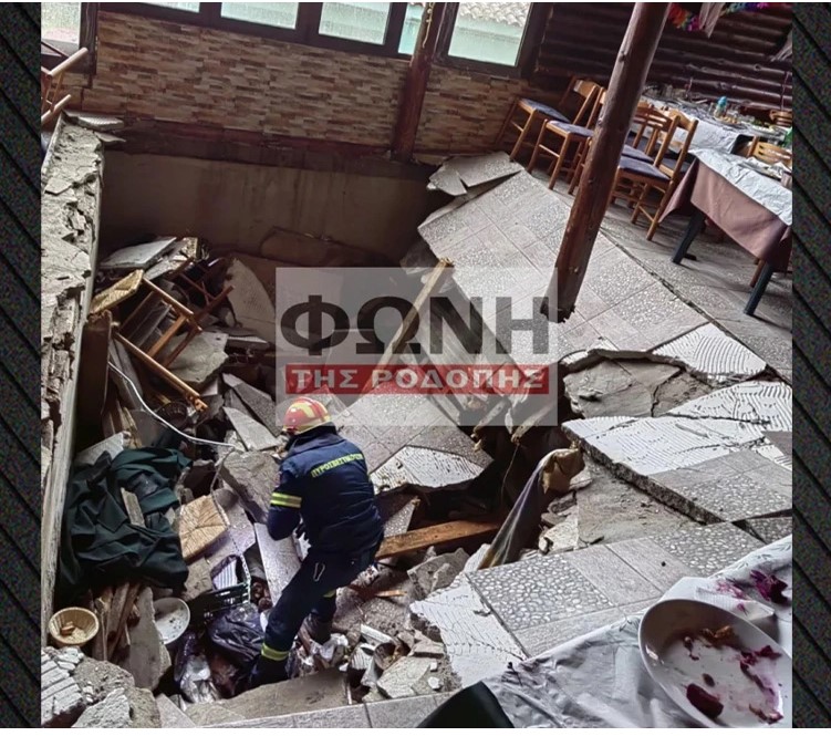 Αναστάτωση σημειώθηκε το μεσημέρι του Σαββάτου (21/2) σε μία ταβέρνα στη Ροδόπη, όταν ξαφνικά ένα τμήμα του πατώματος κατέρρευσε, με αποτέλεσμα πελάτες που κάθονταν σε τέσσερα διαφορετικά τραπέζια να βρεθούν στο κενό.