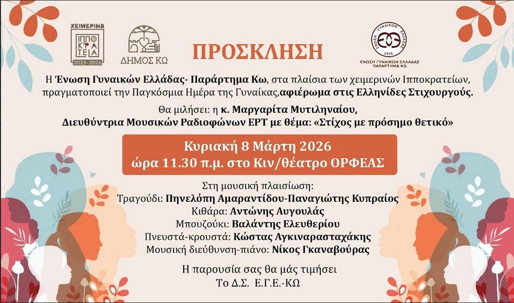 Στο πλαίσιο των Χειμερινών  Πολιτιστικών εκδηλώσεων «Ιπποκράτεια 2025-26» το Τμήμα Πολιτισμού Δήμου Κω σας ενημερώνει για τις προσεχείς εκδηλώσεις: