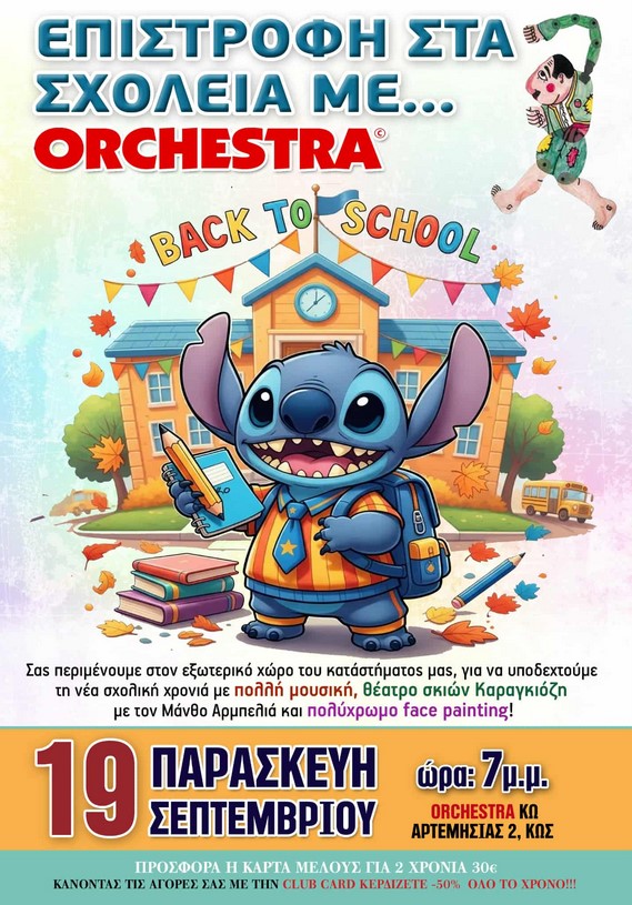 Για 12η συνεχόμενη χρονιά σας περιμένουμε με μεγάλη χαρά στην εκδήλωση μας back to school με θέατρο σκιών Καραγκιόζη με τον Μάνθο Αρμπελια, face painting, μουσική και χαμόγελα, στον χώρο του καταστήματος μας ORCHESTRA, Αρτεμισιας 2 στην Κω