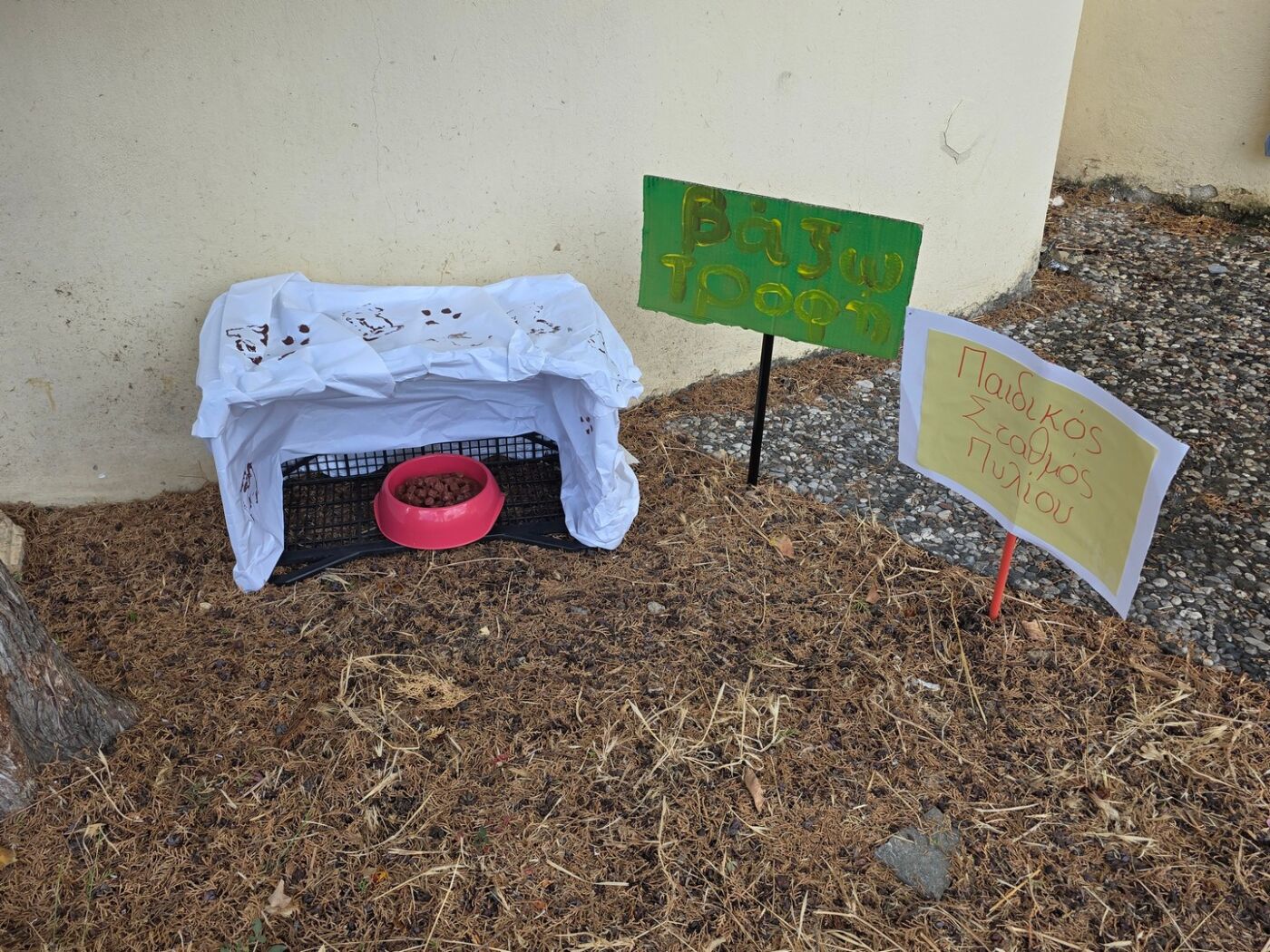 Παράλληλα, έξω από τον σταθμό δημιουργήθηκαν σταθμοί με νερό και τροφή για αδέσποτα ζώα, ενώ οι μαθητές είχαν συλλέξει τροφές και προμήθειες, τις οποίες πρόσφεραν στο σωματείο.