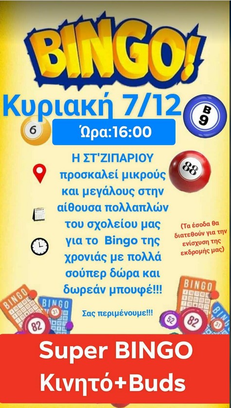 Ατζέντα ΕκδηλώσεωνΕιδήσειςΠαιδί Bingo στο Δημοτικό Σχολείο Ζηπαρίου Κυριακή στις 4μμ (για ενίσχυση της εκδρομής της ΣΤ’) Από aegeanews - 5 Δεκ 2025 0 6 Κοινοποίηση στο Facebook Μοιραστείτε στο X