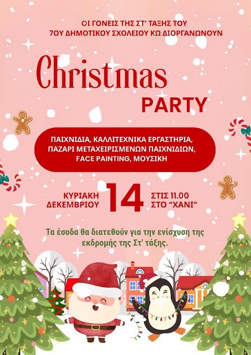 Ατζέντα ΕκδηλώσεωνΕιδήσειςΠαιδί Χριστουγεννιάτικη εκδήλωση από τους γονείς της ΣΤ’ τάξης του 7ου Δημοτικού στο Χάνι Από aegeanews - 8 Δεκ 2025 0 15 Κοινοποίηση στο Facebook Μοιραστείτε στο X Πρόκειται για εκδήλωση που διοργανώνουν οι γονείς της Στ τάξης του 7ου δημοτικού σχολείου της Κω, τα έξοδα της οποίας θα διατεθούν για την ενίσχυση της σχολικής εκδρομής της τάξης.