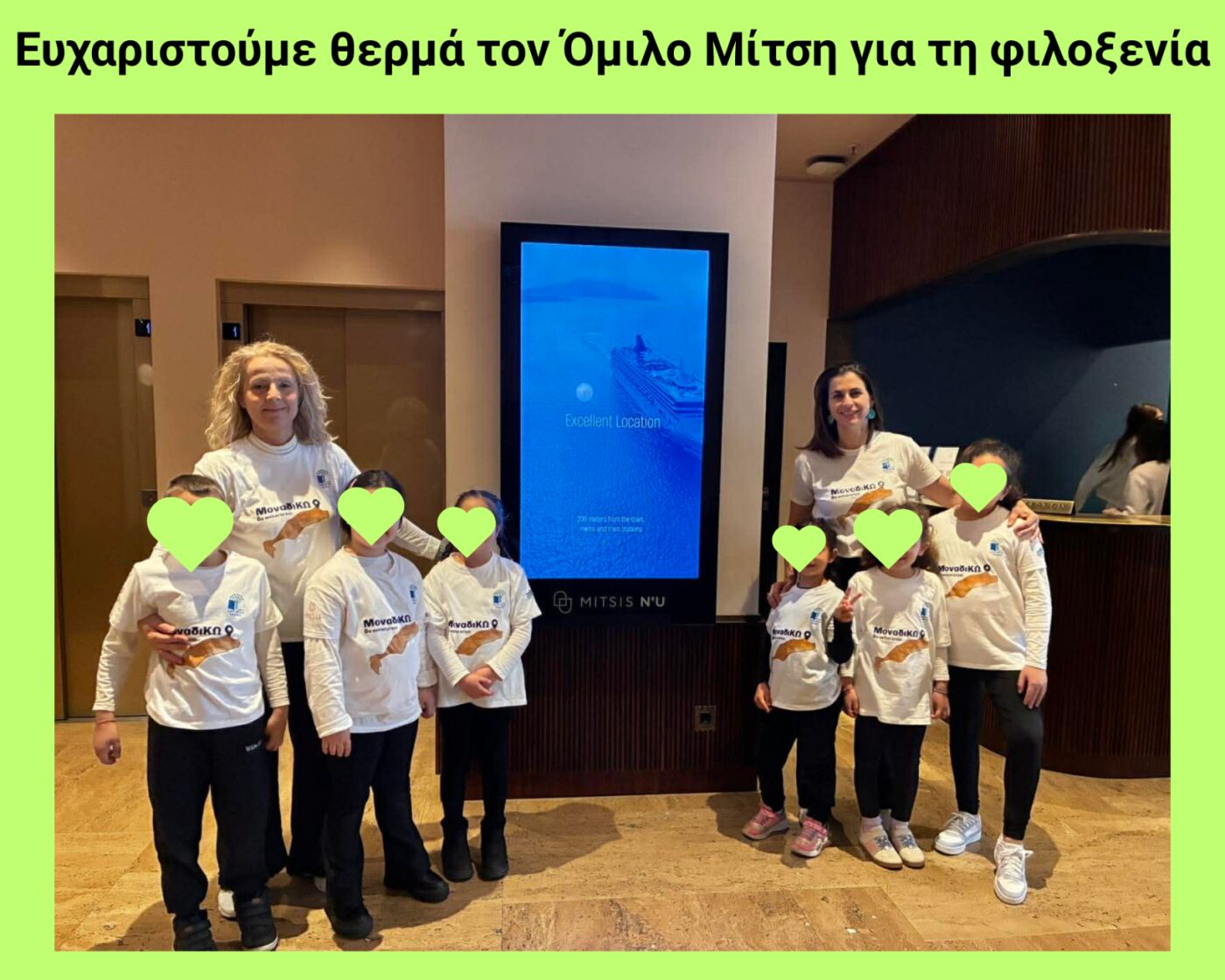 Ο ΌμιλοςΜίτση προσέφερε τη διαμονή της αποστολής, εξασφαλίζοντας ένα ασφαλές, άνετο και φιλόξενο περιβάλλον για τους μαθητές και τους συνοδούς εκπαιδευτικούς, ενισχύοντας την ομαλή και απρόσκοπτη συμμετοχή τους στο Φεστιβάλ. Ευχαριστούμε θερμά τον κ.Χαράλαμπο Ναβροζίδη που μας βοήθησε στην επικοινωνία μας με τον όμιλο Μίτση.