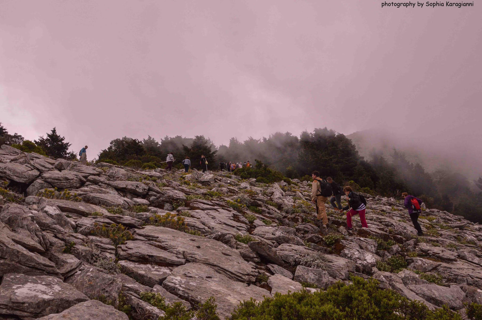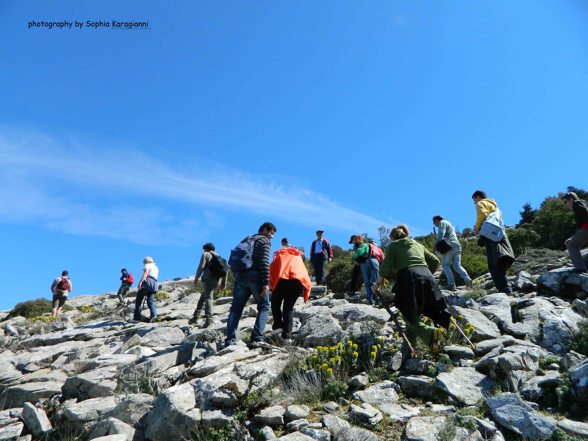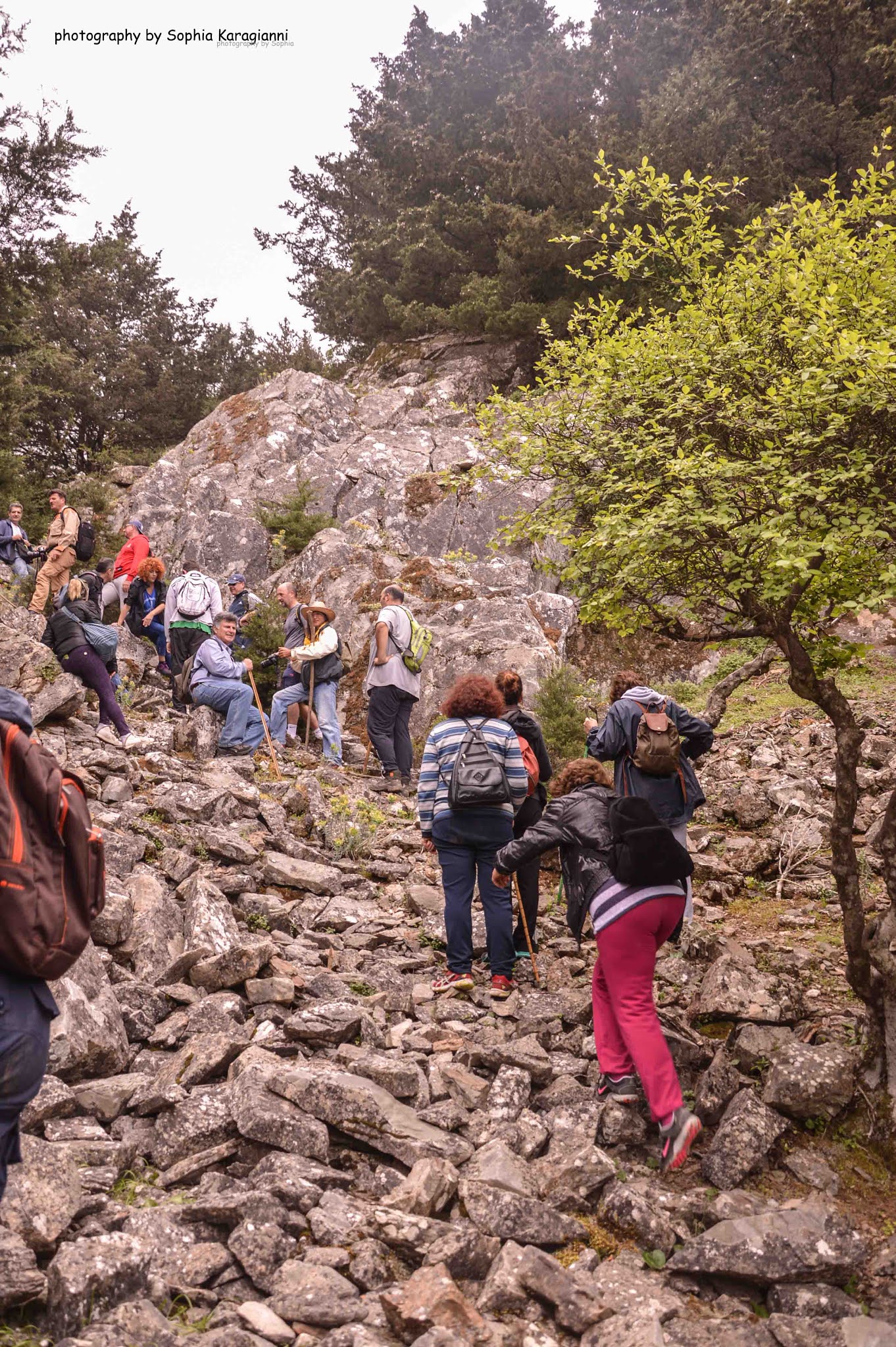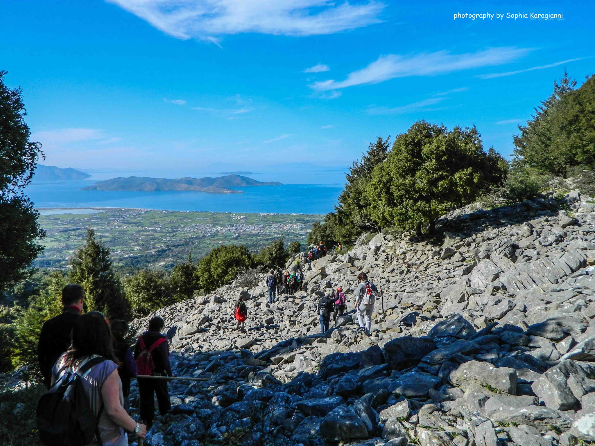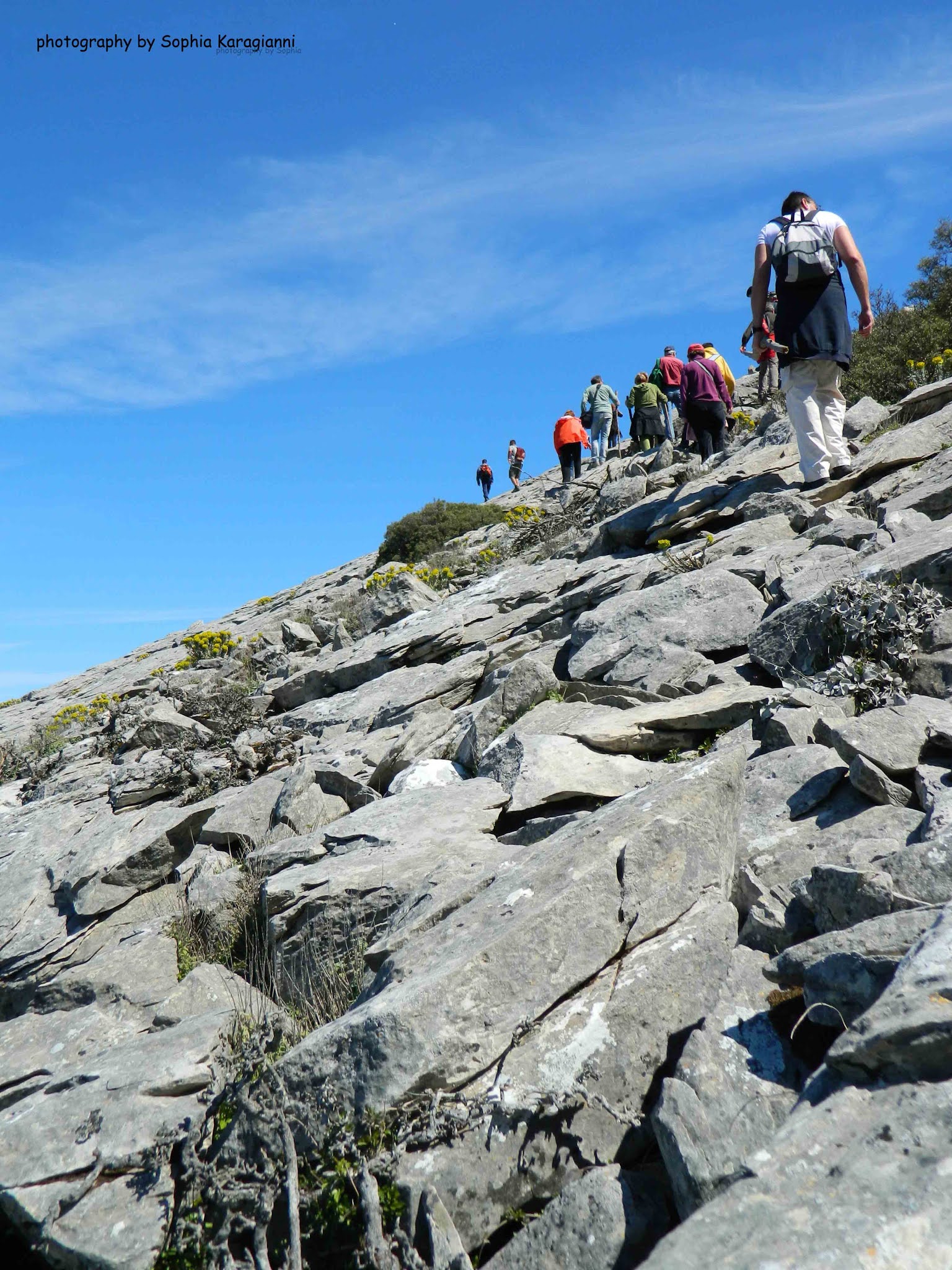 | οι πεζοπόροι βλέπουν από μακριά την Πλακερή και «ζυγίζουν» τη δυσκολία της |
