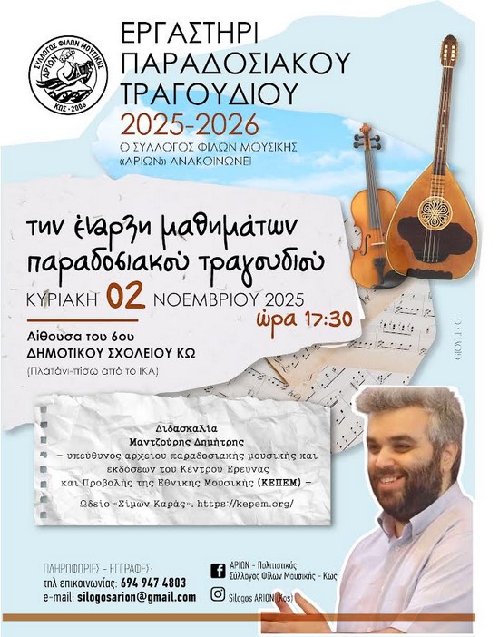 Ο σύλλογος μας ανακοινώνει με χαρά την έναρξη, στις 2/11/2025, των μαθημάτων παραδοσιακού τραγουδιού για 2η συνεχόμενη χρονιά, με τον Δημήτρη Μαντζούρη!
