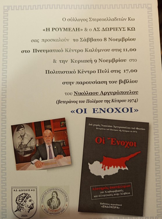 ΠΑΡΟΥΣΙΑΣΗ του βιβλίου «ΟΙ ΕΝΟΧΟΙ» του συγγραφέα ΝΙΚΟΛΑΟΥ ΑΡΓΥΡΟΠΟΥΛΟΥ σε συνεργασία με το ΣΥΛΛΟΓΟ ΣΤΕΡΕΟΕΛΛΑΔΙΤΩΝ ΚΩ «Η ΡΟΥΜΕΛΗ»