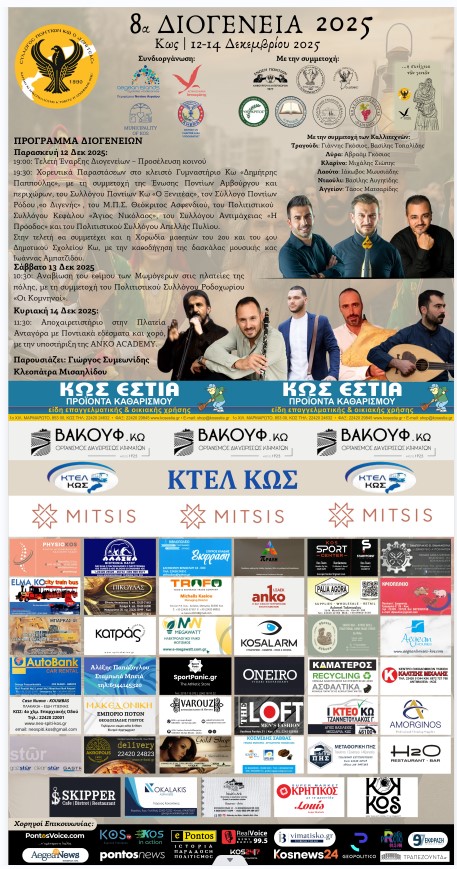 Ένα μεγάλο ευχαριστώ σε όλους τους χορηγούς που στηρίζουν έμπρακτα τη διοργάνωση και συμβάλλουν ώστε τα «Διογένεια» να μεγαλώνουν και να εξελίσσονται κάθε χρόνο. Ευχαριστούμε επίσης θερμά τους χορηγούς επικοινωνίας που προβάλλουν την προσπάθεια, μεταφέρουν το μήνυμα του Ποντιακού πολιτισμού από την Ιπποκρατική Κω και φέρνουν πιο κοντά την παράδοση σε κάθε σπίτι.