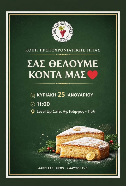 Το Δ.Σ. του συλλόγου ΜΠΕΣ ΑΠΕΛΛΗΣ σας προσκαλεί στην κοπή της βασιλόπιτας που θα γίνει την Κυριακή 25 Ιανουαρίου 2026 και ωρα 11:00 στην καφετέρια «level up»στον Άγιο Γεώργιο