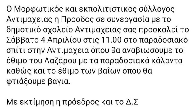 Ατζέντα ΕκδηλώσεωνΕιδήσειςΠολιτισμός - Τέχνες «Πρόοδος»Αντιμάχειας: Τμο του Λαζάρου αναβιώνει το Σάββατο στις 11πμ στο παραδοσιακό σπίτι Αντιμάχειας Από aegeanews - 31 Μαρ 2026 0 13 Κοινοποίηση στο Facebook Μοιραστείτε στο X