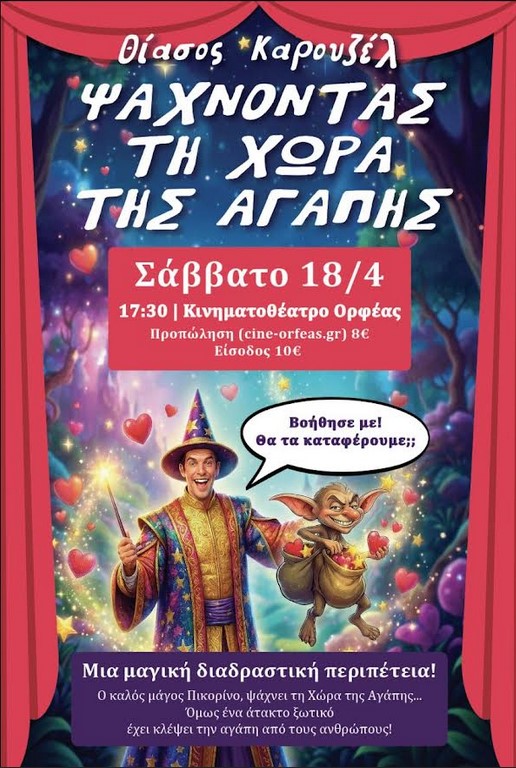 Προπώληση: 10 ευρώ (https://cine-orfeas.gr/product/theatro/)