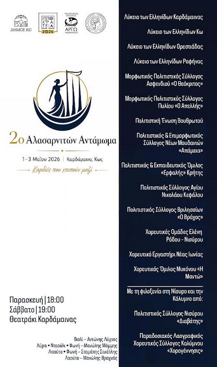 Από την Παρασκευή 1 έως και την Κυριακή 3 Μαΐου 2026, η Καρδάμαινα της Κω θα φιλοξενήσει το 2ο Αλασαρνιτών Αντάμωμα, μια συνάντηση πολιτιστικών συλλόγων από διαφορετικά μέρη της Ελλάδας.