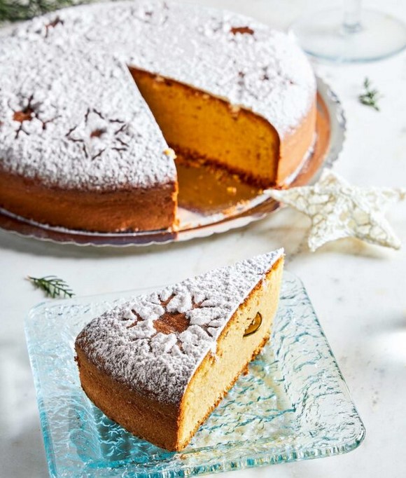 Ανακατεύουμε σταδιακά τα υλικά και ψήνουμε το μείγμα σε ένα στρογγυλό ταψί, στρωμένο με λαδόκολλα, στους 180ο βαθμούς, για 60΄ λεπτά περίπου. Αφήνουμε να κρυώσει και πασπαλίζουμε, με ζάχαρη άχνη και με κανέλλα.