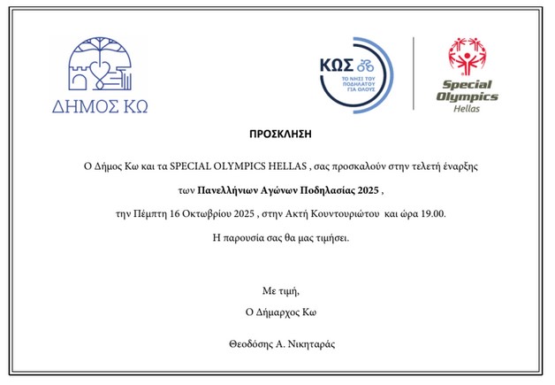 ΕιδήσειςΑθλητικάΑτζέντα Εκδηλώσεων Δήμος Κω-Special Olympics Hellas: Πρόσκληση στην τελετή έναρξης των Πανελλήνιων αγώνων Ποδηλασίας Από aegeanews - 13 Οκτ 2025 0 23 Κοινοποίηση στο Facebook Μοιραστείτε στο X