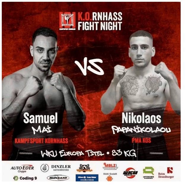 Ο Παπανικολάου, που προέρχεται από το σωματείο PMA KOS, αντιμετώπισε τον Γερμανό αντίπαλό του, Samuel Mai (από το Kampfsport Kornhass), στην διοργάνωση K.O. RNHASS FIGHT NIGHT. Η αναμέτρηση, όπως προδίδει και η αφίσα του αγώνα, αναμενόταν με μεγάλο ενδιαφέρον, καθώς αφορούσε μια σημαντική διάκριση σε ευρωπαϊκό επίπεδο, τιμώντας τον τόπο καταγωγής του αθλητή, την Κω