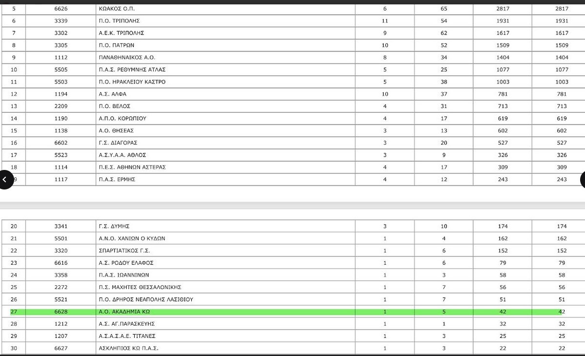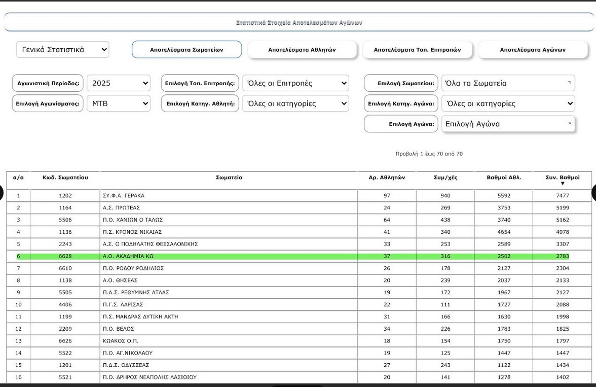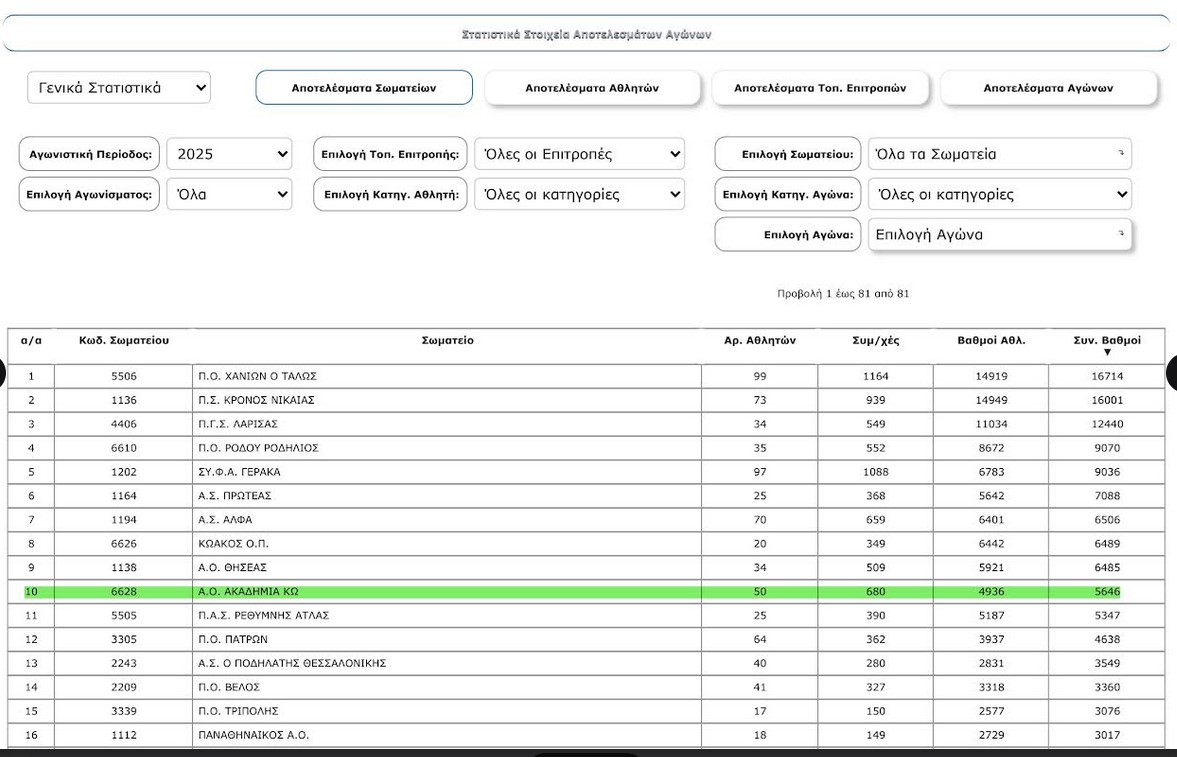 Χαρακτηριστικός είναι και ο αριθμός των αθλητών που συμμετείχαν σε αγώνες από κάθε σωματείο όπως φαίνεται στη γενική βαθμολογία, με την Ακαδημία Κω να είναι το 6ο σωματείο με τους περισσότερους αθλητές στην Ελλάδα. Λαμβάνοντας υπόψη τον μικρό πληθυσμό του νησιού μας, το να είναι βρίσκεται η Ακαδημία στην 6η θέση από πλευράς αριθμού αθλητών είναι ένα μεγάλο επίτευγμα, αποτέλεσμα της σπουδαίας δουλειάς που γίνεται από την προπονητική μας ομάδα και της αγάπης και μεγάλης ανταπόκρισης των συμπολιτών μας σε αυτό το σπουδαίο έργο που επιτελεί η ομάδα μας.