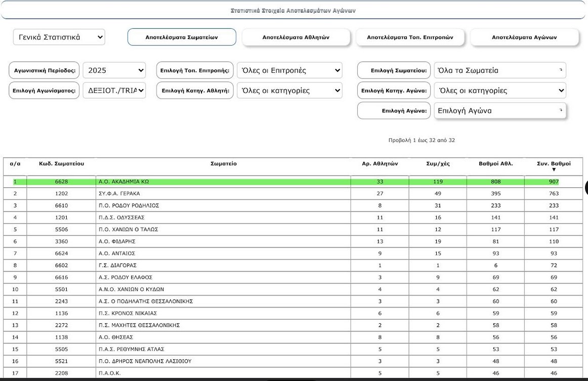 - Τη βαθμολογία στο αγώνισμα της ΠΙΣΤΑΣ, στο οποίο η Ακαδημία συμμετείχε με μόνο έναν αθλητή και κατετάγη 27η