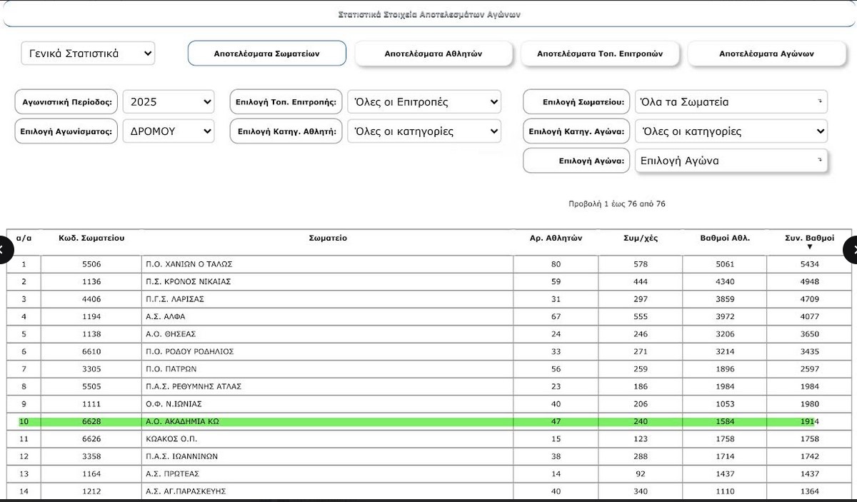 - Τη βαθμολογία στο αγώνισμα του ΔΡΟΜΟΥ, με την Ακαδημία να κατατάσσεται 10η