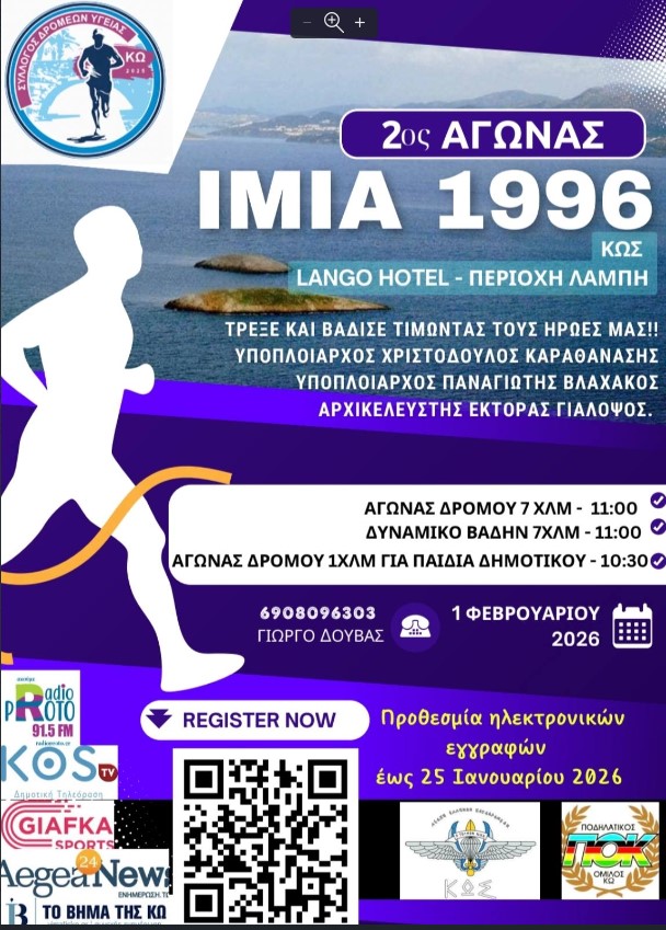 Ο πρώτος αγώνας για το 2026 «Ίμια 1996» θα πραγματοποιηθεί στις 01 Φεβρουαρίου 2026. Είναι το ελάχιστο που μπορούμε να κάνουμε προκειμένου να τιμήσουμε τους τρεις ήρωες του ελικοπτέρου που κατέπεσε στη θαλάσσια περιοχή των Ιμίων.