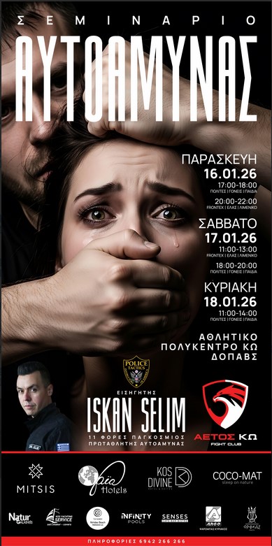 Ο Aetos Sports Club ανακοινώνει την παρουσία στην Κω του Iskan Selim, 11 φορές Παγκόσμιου Πρωταθλητή Αυτοάμυνας, ενός από τους κορυφαίους εκπαιδευτές παγκοσμίως σε ρεαλιστικές τεχνικές αυτοπροστασίας.
