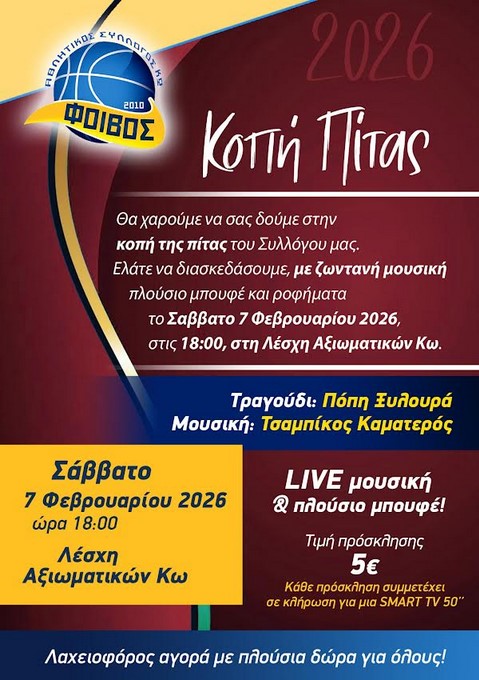 ΕιδήσειςΑθλητικάΑτζέντα Εκδηλώσεων ΑΣ Φοίβος Κω: Κοπή πίτας το Σάββατο 07 Φεβρουαρίου στις 6μμ στη Λέσχη Αξιωματικών Από aegeanews - 28 Ιαν 2026 0 7 Κοινοποίηση στο Facebook Μοιραστείτε στο X