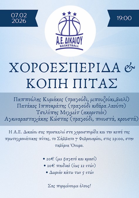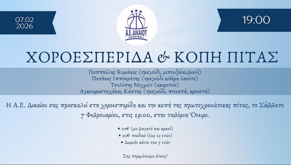 Η Α.Ε. Δικαίου σας προσκαλεί στη χοροεσπερίδα και κοπή της πρωτοχρονιάτικης πίτας, το Σάββατο 7 Φεβρουαρίου, στις 19:00, στην ταβέρνα Όνειρο.