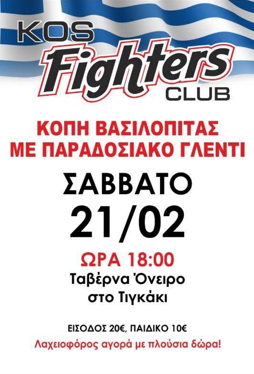 Το Διοικητικό Συμβούλιο του Σωματείου «ΜΑΧΗΤΕΣ ΤΗΣ ΚΩ (KOS FIGHTERS CLUB)» ανακοινώνει τη διοργάνωση της ετήσιας χοροεσπερίδας του, η οποία θα πραγματοποιηθεί το Σάββατο 21 Φεβρουαρίου 2026, στην ταβέρνα «Όνειρο», στο Τιγκάκι, με ώρα έναρξης 18:00.