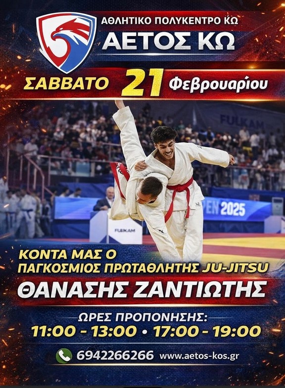 Στην Κω θα βρεθεί το Σάββατο 21 Φεβρουαρίου ο παγκόσμιος πρωταθλητής Ju-Jitsu Θανάσης Ζαντιώτης, στο πλαίσιο ειδικής προπονητικής δράσης υψηλού επιπέδου, με στόχο την αγωνιστική και τεχνική εξέλιξη των αθλητών του νησιού.