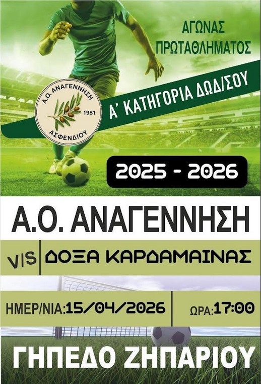 Για την 26η αγωνιστική της Α’ Κατηγορίας Δωδεκανήσου, η ομάδα μας υποδέχεται την Τετάρτη 15 Απριλίου στις 17:00 την Δόξα Καρδάμαινας.