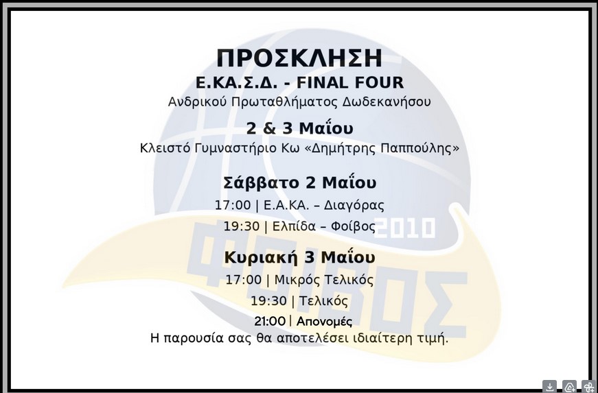 Συνέντευξη τύπου παραχώρησε ο πρόεδρος του Φοίβου Κω Νίκος Μιμερίνης αναφορικά με την προετοιμασία και την οργάνωση του Final 4 Δωδεκανήσου που θα διεξαχθεί το Σαββατοκύριακο στο νησί.