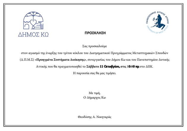 Το Μεταπτυχιακό Πρόγραμμα υλοποιείται από το Πανεπιστήμιο Δυτικής Αττικής, με τη στήριξη του Δήμου Κω.