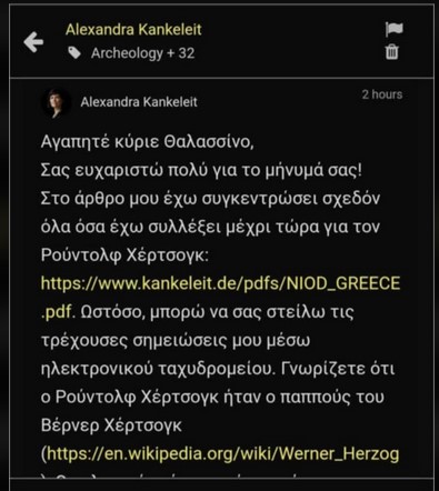 Και εκεί που σταματούσε η δική μου έρευνα ξεκινούσε η έρευνα της αρχαιολόγου και ιστορικού Alexandra Kankeleit.