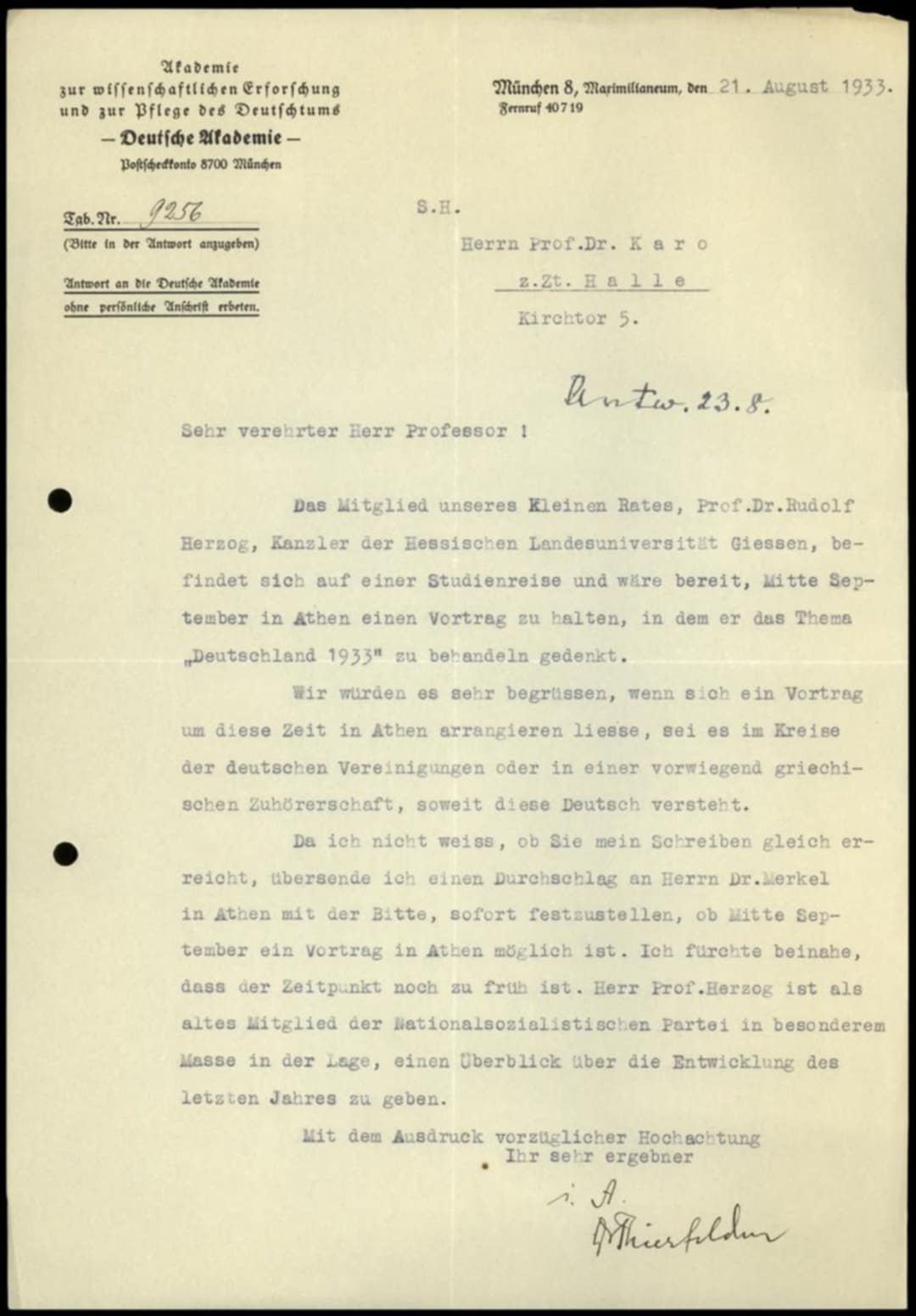 Επειδή δεν γνωρίζω αν η επιστολή μου θα σας φθάσει άμεσα, στέλνω ένα αντίγραφο και στον κύριο Δρ. Μέρκελ στην Αθήνα με την παράκληση να διαπιστώσει αμέσως εάν είναι εφικτό να πραγματοποιηθεί διάλεξη στην Αθήνα στα μέσα Σεπτεμβρίου. Φοβάμαι μάλιστα ότι το χρονικό σημείο είναι ακόμη πολύ νωρίς. Ο Καθηγητής Χέρτσογκ, ως παλαιό μέλος του Εθνικοσοσιαλιστικού Κόμματος, βρίσκεται σε ιδιαίτερη θέση να δώσει μια συνολική εικόνα για τις εξελίξεις του τελευταίου έτους.