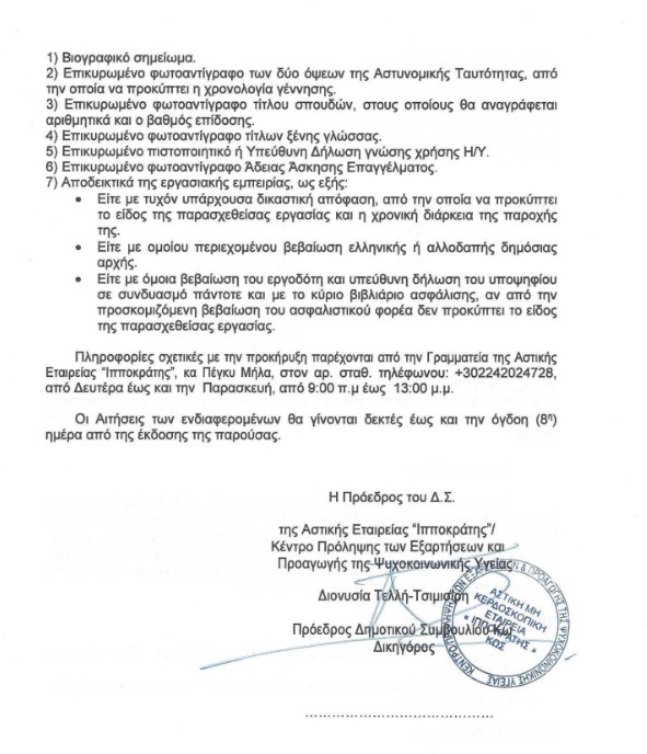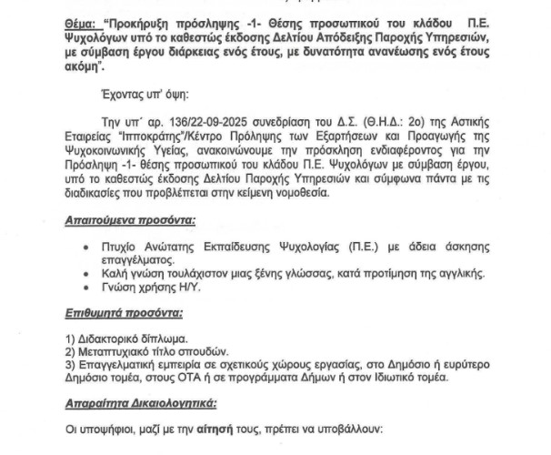 ΕιδήσειςΕν ΔωδεκανήσωΤα εν δήμω Αστική Εταιρεία «Ιπποκράτης»: Προκήρυξη Πρόσληψης -1- θέσης προσωπικού του κλάδου Π.Ε. Ψυχολόγων Από aegeanews - 1 Δεκ 2025 0 7 Κοινοποίηση στο Facebook Μοιραστείτε στο X