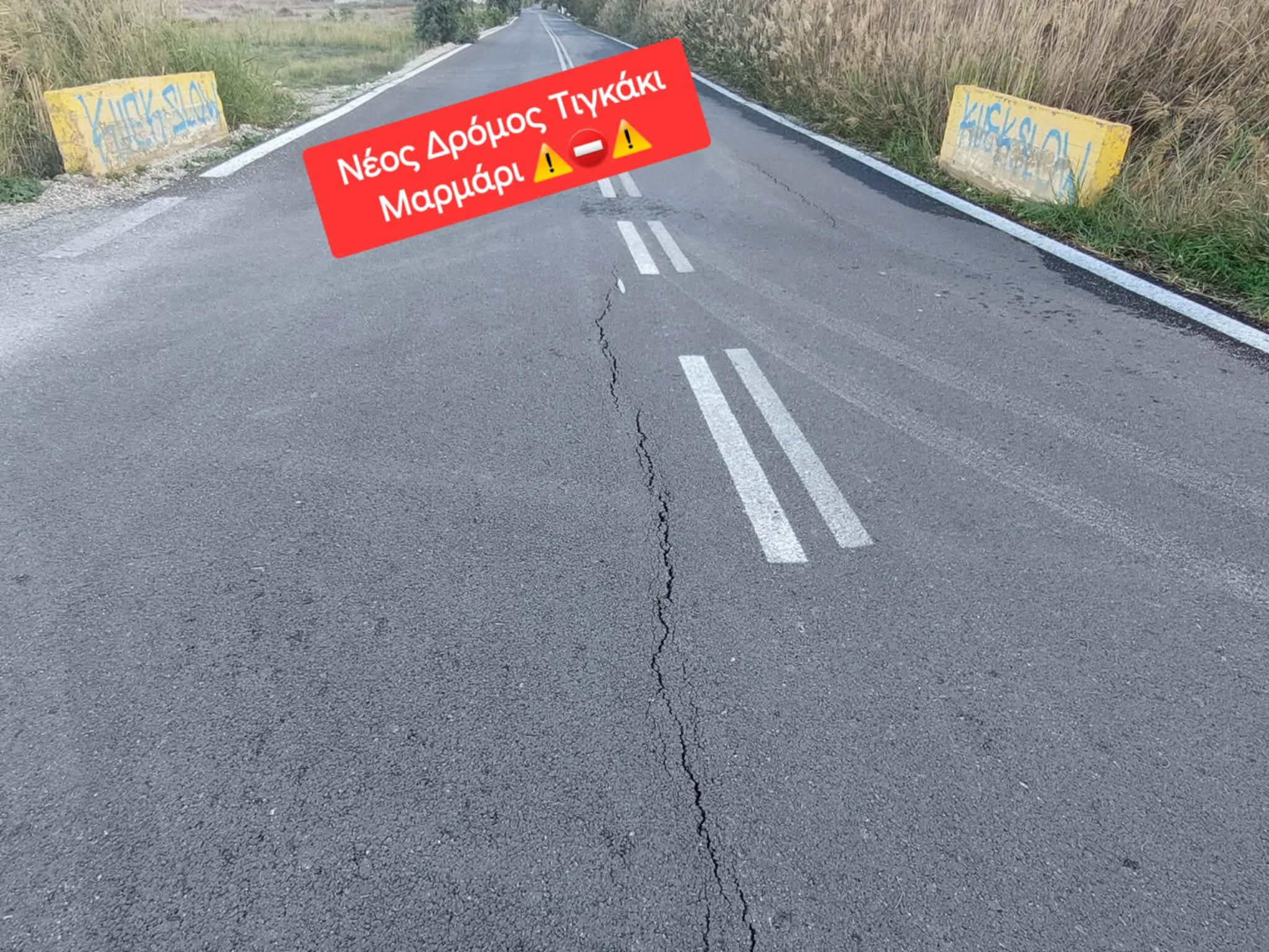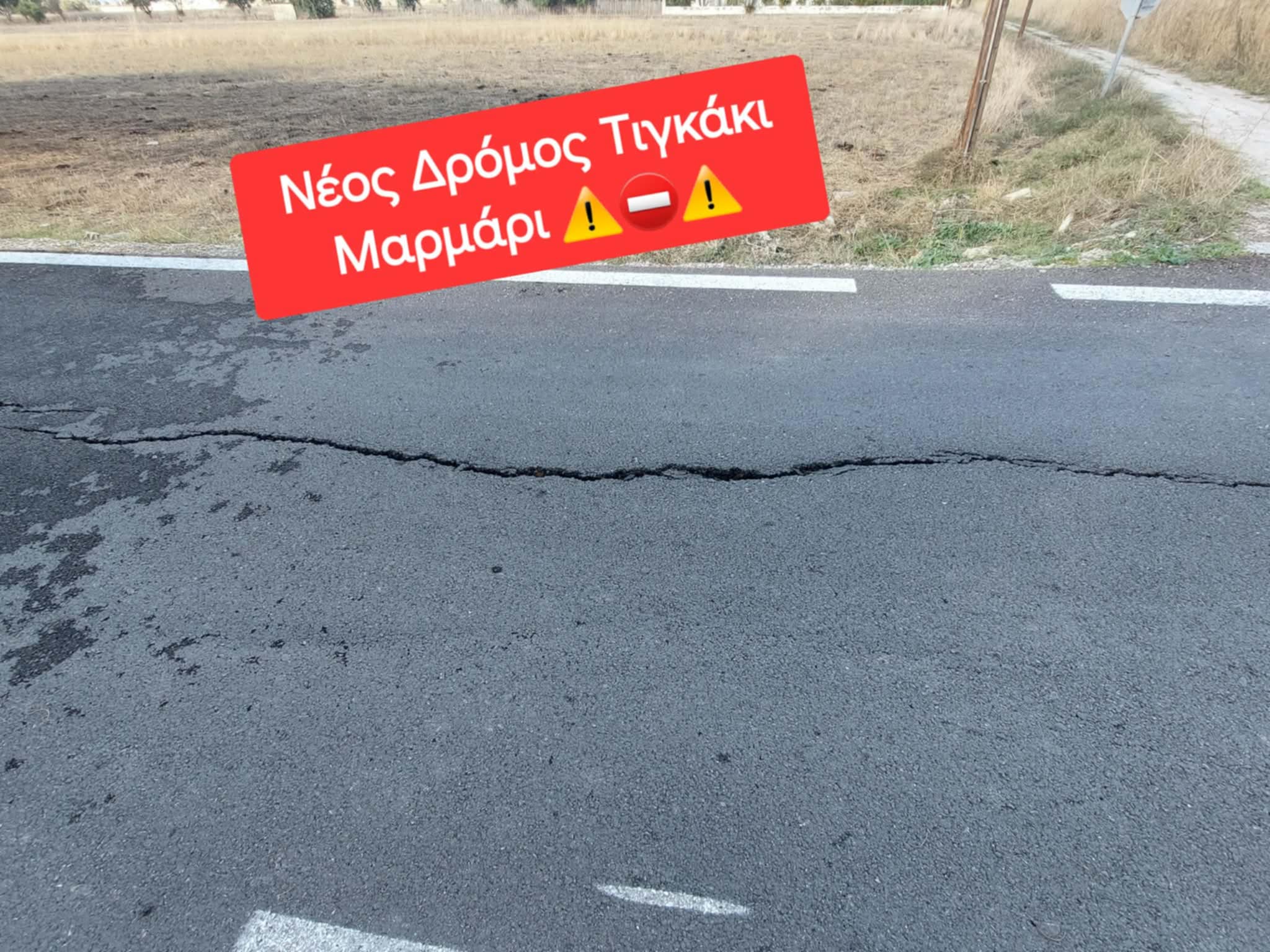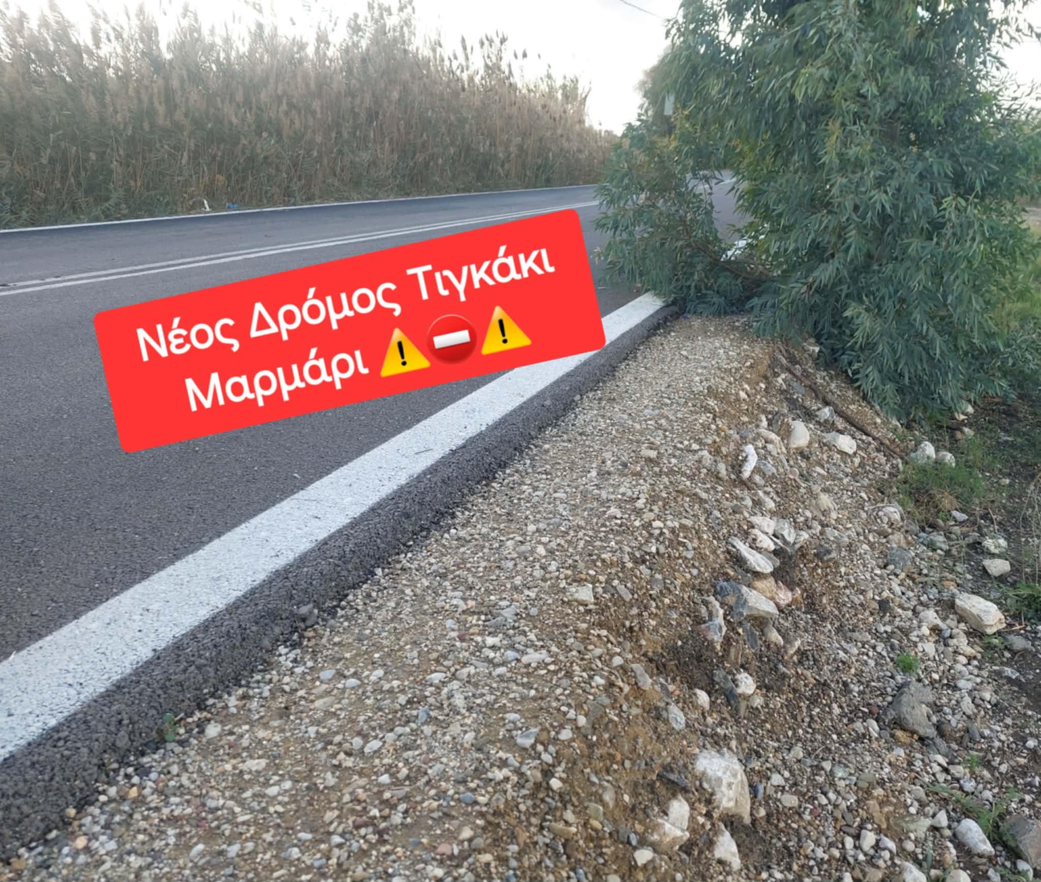 Επισήμανση : Ο δρόμος πραγματικά αν και υλοποιήθηκε δυστυχώς δεν ακουστήκαμε ούτε εγώ ούτε το κοινοτικό συμβούλιο καθώς η πρόταση μου και πρόταση μας προς τον δήμαρχο τότε ήταν η συνέχιση πεζοδρομίου και ηλεκτροφωτισμού προς Μαρμάρι από εκεί που είχε σταματήσει στο Τιγκάκι . π.χ. διατηρηθήκαν τα παλαιωμένα φωτιστικά τύπου ΔΕΗ που είναι μη επαρκή για έναν δρόμο με πολύ κυκλοφορία ιδιαίτερα το καλοκαίρι.