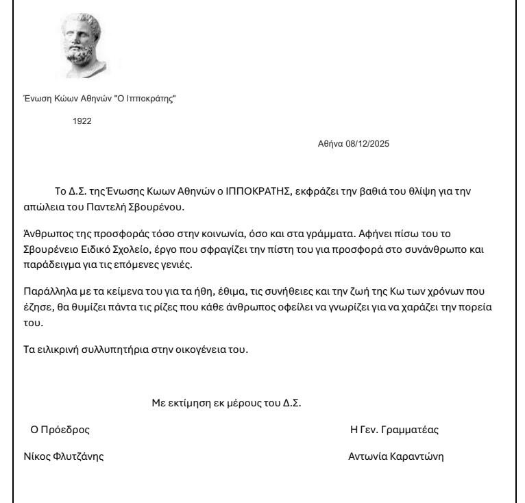 Συλλυπητήριο μήνυμα Ένωσης Κώων Αθηνών » Ο Ιπποκράτης»